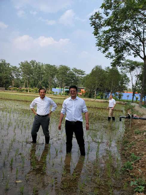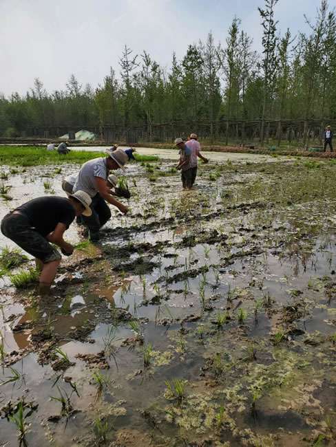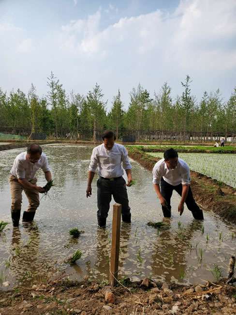 日前,南宁翰林线下体验中心有限公司董事长梁雨、总裁谢俊率集团高级管理人员来到位于北京西四环外的锦绣大地生态园,在景色迷人的玉泉山山下,同志们挽起裤脚跃进田里,生态园农业技术员一边弓腰示范,一边讲解道“插秧是个技术活,将秧苗窝在虎口处,既要轻又要稳,用巧劲儿将秧苗抛在泥里,不能抛得太深,又要确保植保灌溉时,秧苗不漂浮在水面上。”